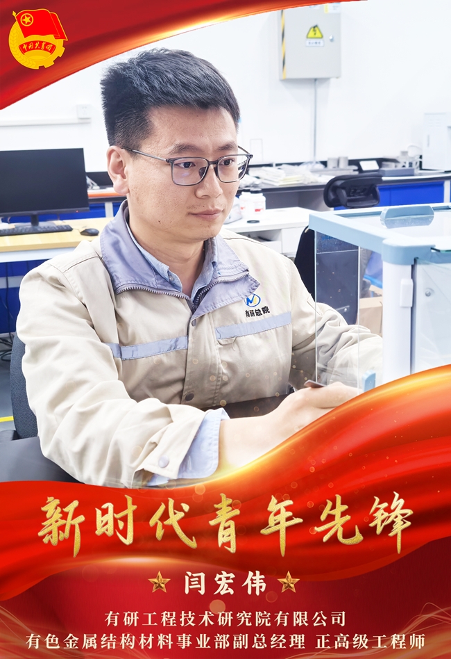 閆宏偉,中共黨員,有研工研院有色金屬結(jié)構(gòu)材料事業(yè)部副總經(jīng)理,正高級工程師,入選國家級青年人才計劃、中國科協(xié)青年人才托舉工程。他致力于先進(jìn)鋁合金、新型輕質(zhì)合金材料與制備加工技術(shù)創(chuàng)新,面向航空航天、交通運輸?shù)阮I(lǐng)域高端裝備輕量化需求,銳意創(chuàng)新、攻堅克難,以關(guān)鍵共性技術(shù)攻關(guān)支撐大飛機(jī)用鋁合金厚板實現(xiàn)全面自主可控,以原始創(chuàng)新輕質(zhì)高強(qiáng)鋁合金材料支撐裝備結(jié)構(gòu)輕量化迭代升級。他負(fù)責(zé)或骨干參與大飛機(jī)材料專項、重點研發(fā)等國家級科研任務(wù)34項,獲國家科技進(jìn)步二等獎1項、中國有色金屬工業(yè)科學(xué)技術(shù)獎4項;獲評中央企業(yè)青年崗位能手、中國有研首屆“有研工匠”等。
