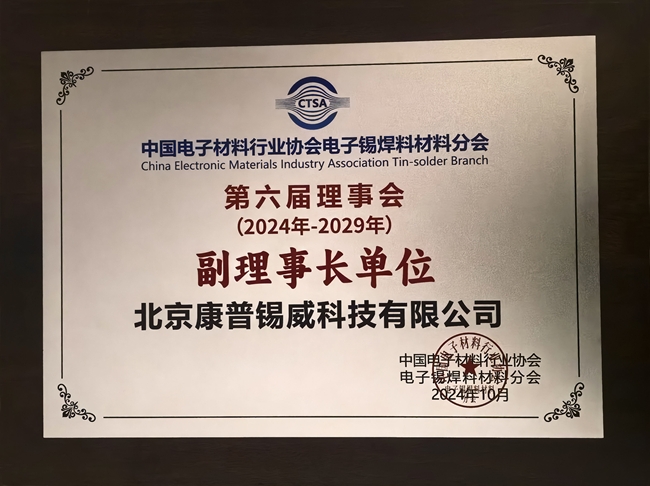會(huì)議期間召開六屆一次會(huì)員代表大會(huì)進(jìn)行理事會(huì)換屆,康普錫威當(dāng)選為電子錫焊料材料分會(huì)的副理事長單位,這是康普錫威連續(xù)第四次當(dāng)選為副理事長單位,康普錫威副總經(jīng)理劉希學(xué)代表公司接受授牌。