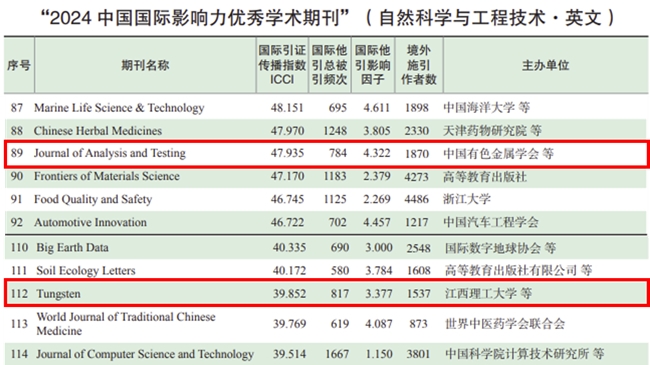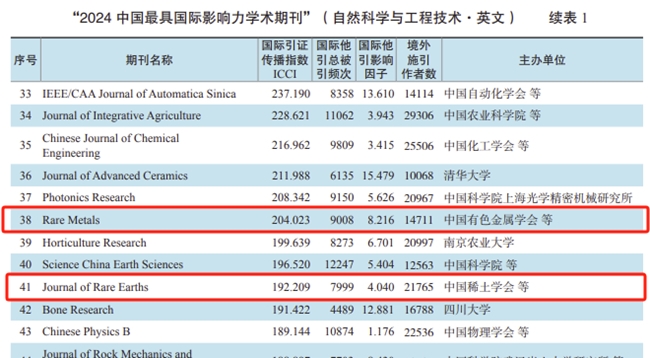 12月24日,《中國(guó)學(xué)術(shù)期刊國(guó)際引證年報(bào)(2024版)》重磅發(fā)布,有科出版旗下4本英文期刊再次入選中國(guó)國(guó)際影響力學(xué)術(shù)期刊榜單。其中,Rare Metals(《稀有金屬(英文)》)、Journal of Rare Earths(《稀土學(xué)報(bào)(英文)》連續(xù)13年入選“中國(guó)最具國(guó)際影響力學(xué)術(shù)期刊”;Journal of Analysis and Testing(《分析檢測(cè)(英文)》)、Tungsten(《鎢科技(英文)》)連續(xù)3年入選“中國(guó)國(guó)際影響力優(yōu)秀學(xué)術(shù)期刊”。