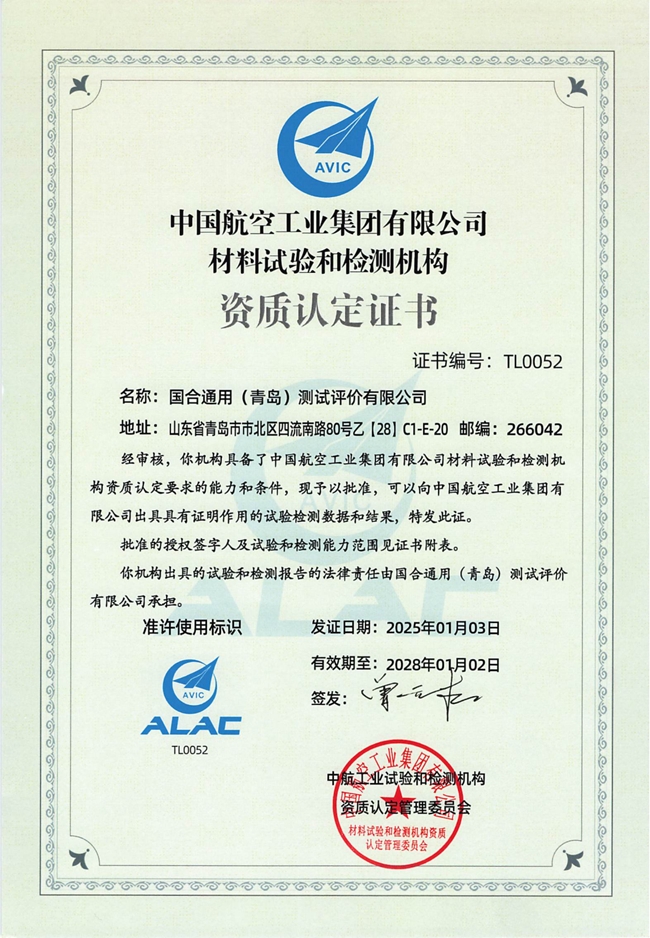 近日,國合通用(青島)測試評價有限公司順利取得中國航空工業(yè)集團有限公司材料試驗和檢測機構資質(zhì)認證(ALAC)證書。至此,國合青島已相繼取得CMA、CNAS、NADCAP((MTL/NMMT)、航空領域特殊過程評價ASP((MTL/NMMT)、航空工業(yè)ALAC(MM/CM/NM)、中國航發(fā)AECC(MTL)等檢測資質(zhì),成為國內(nèi)航空材料檢測資質(zhì)覆蓋最全的機構之一。