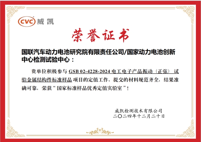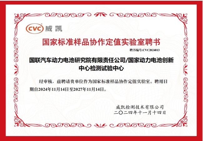 國聯(lián)研究院國家動力電池創(chuàng)新中心檢測試驗中心獲聘中國電器科學(xué)研究院股份有限公司CVC威凱“國家標(biāo)準(zhǔn)樣品協(xié)作定值實驗室”,并榮獲“國家標(biāo)準(zhǔn)樣品優(yōu)秀定值實驗室”。
