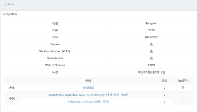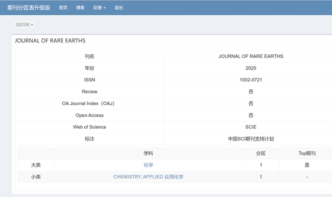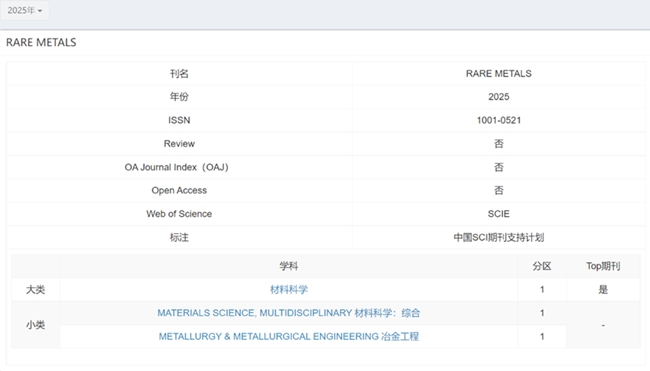 3月20日,《2025年中國(guó)科學(xué)院文獻(xiàn)情報(bào)中心期刊分區(qū)表》正式發(fā)布。有科出版負(fù)責(zé)出版的RARE METALS(《稀有金屬(英文版)》)、Journal of Rare Earths(《稀土學(xué)報(bào)(英文)》)繼續(xù)穩(wěn)居1區(qū)、入選Top。Journal of Analysis and Testing(《分析檢測(cè)(英文)》)新晉1區(qū)Top,Tungsten(《鎢科技(英文)》)新晉2區(qū),英文期刊影響力提升取得了新的突破。