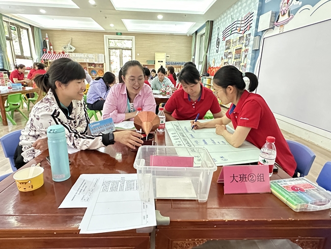 在教研現(xiàn)場,幼兒園展示了生動的室外自主游戲,孩子們積極主動、認(rèn)真專注、大膽創(chuàng)想、勇于挑戰(zhàn),教師認(rèn)真觀察、支持幼兒自主選擇。交流環(huán)節(jié),分園執(zhí)行園長楊益以 “杯墊” 記錄法為抓手,串聯(lián)場景回顧、要點對接、雙向互動等環(huán)節(jié),進行經(jīng)驗分享。
