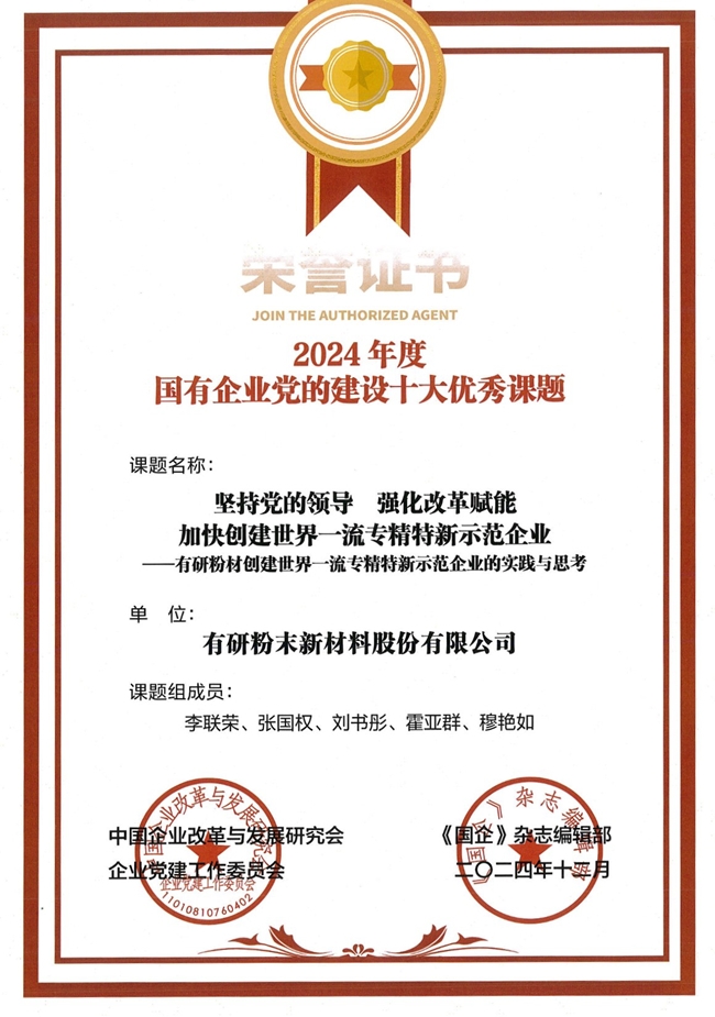 12月6日,在珠海舉辦的(第三屆)國(guó)有企業(yè)黨的建設(shè)論壇上,有研粉材黨建成果《堅(jiān)持黨的領(lǐng)導(dǎo)、強(qiáng)化改革賦能,加快建設(shè)世界一流專(zhuān)精特新示范企業(yè)——有研粉材創(chuàng)建世界一流專(zhuān)精特新示范企業(yè)的實(shí)踐與思考》,被評(píng)為“2024年度國(guó)有企業(yè)黨的建設(shè)十大優(yōu)秀課題”。