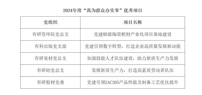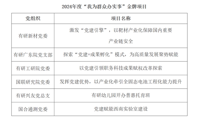 2024年度,各級(jí)黨組織聚焦本單位有關(guān)科技創(chuàng)新、生產(chǎn)銷售、深化改革、人才發(fā)展、職能管理、職工權(quán)益等方面的難點(diǎn)、堵點(diǎn)、痛點(diǎn)工作,在集團(tuán)立項(xiàng)19個(gè)“我為群眾辦實(shí)事”項(xiàng)目。經(jīng)組織評(píng)審組專家答辯評(píng)審、結(jié)題評(píng)審等,共評(píng)出6項(xiàng)年度“我為群眾辦實(shí)事”金牌項(xiàng)目、5項(xiàng)優(yōu)秀項(xiàng)目,名單如下: