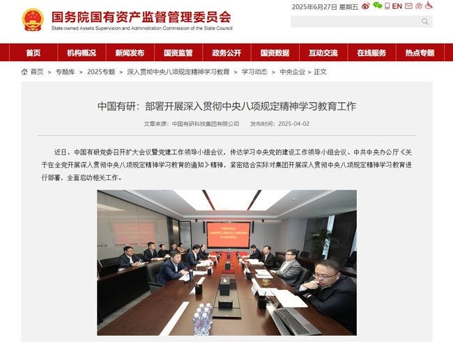 4月2日國(guó)務(wù)院國(guó)資委官網(wǎng)報(bào)道中國(guó)有研部署開展工作情況