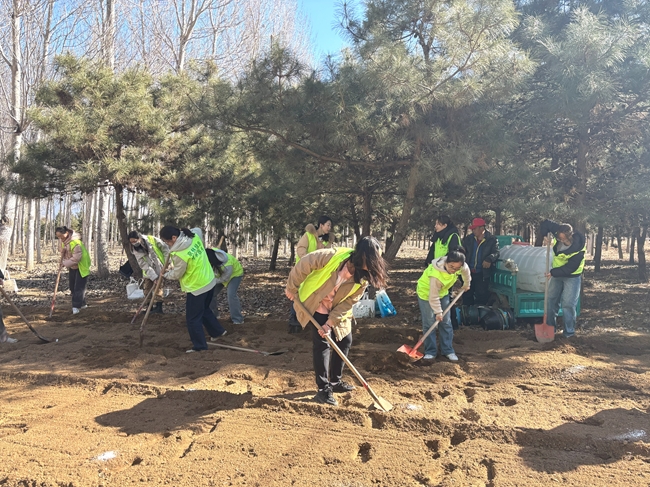 活動(dòng)伊始,基地工作人員詳細(xì)講解了樹木種植及養(yǎng)護(hù)知識(shí)。領(lǐng)取樹苗和工具后,眾人手持鐵鍬,熱情高漲、干勁十足,分成多個(gè)小組投身植樹護(hù)綠行動(dòng)。鏟土挖坑、踩土固苗、填土圍堰、澆水護(hù)苗,在大家齊心協(xié)力的努力下,35株側(cè)柏扎根于此。原本空曠的土地上,新栽的樹苗錯(cuò)落有致,在微風(fēng)中展現(xiàn)出勃勃生機(jī)。大家還完成了基地150余株林木的撫育任務(wù)。