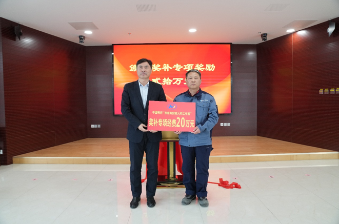 王興權(quán)為技能大師工作室頒發(fā)獎補(bǔ)專項獎勵。