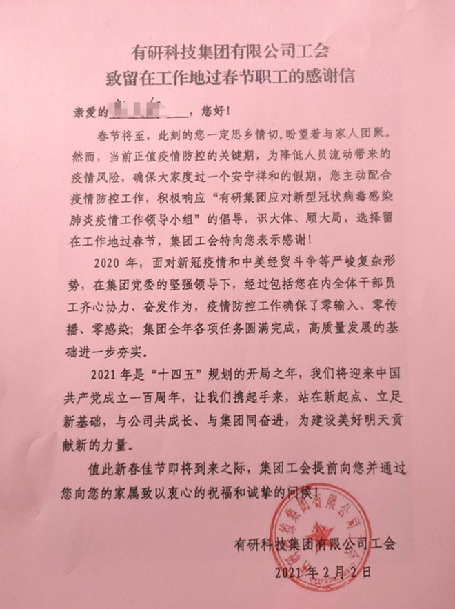 2021年春節(jié)假期,為配合國家疫情防控工作,有研集團(tuán)廣大職工積極響應(yīng),選擇留在工作地過春節(jié)。為了讓就地過年的職工度過一個(gè)有溫度有意義的新春佳節(jié),集團(tuán)黨委統(tǒng)一部署、精心組織,推出系列暖心舉措。