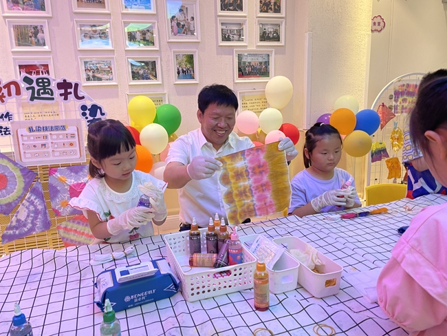 劉顯清一行先后走進(jìn)兩所幼兒園的班級(jí)教室、美術(shù)教室、多功能廳,參觀了活動(dòng)環(huán)境,來(lái)到孩子們身邊,觀看了“國(guó)學(xué)擂臺(tái)賽”“國(guó)風(fēng)時(shí)裝秀”“足球小將”等豐富多彩的迎“六一”活動(dòng),并參與了游戲項(xiàng)目“初遇扎染”,和孩子們一起歡慶節(jié)日。