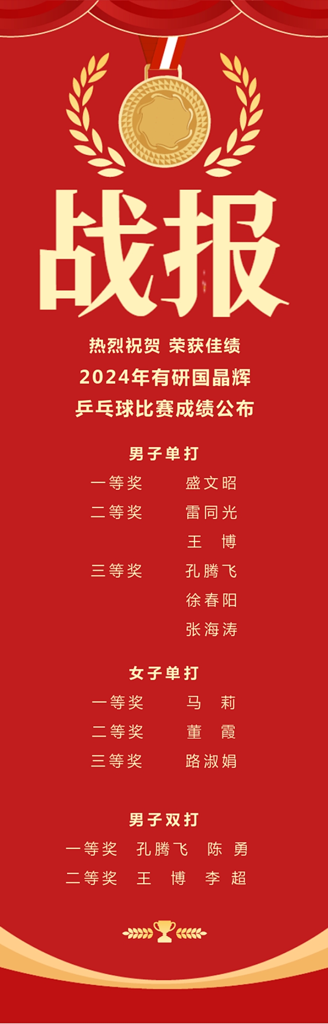 由有研國(guó)晶輝工會(huì)舉辦的職工乒乓球比賽經(jīng)過(guò)數(shù)日的激烈角逐于近日落幕。本次比賽吸引了公司眾多乒乓球愛(ài)好者熱情參與,比賽設(shè)男子單打、女子單打和男子雙打三個(gè)項(xiàng)目。