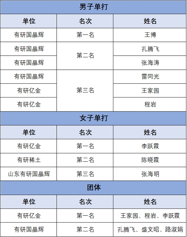 經(jīng)過激烈的比賽,各項(xiàng)冠軍紛紛出爐。有研億金憑借出色的團(tuán)隊(duì)協(xié)作和實(shí)力奪得了團(tuán)體賽桂冠,有研國晶輝王博和有研億金李躍霞分別獲得男子單打和女子單打冠軍。