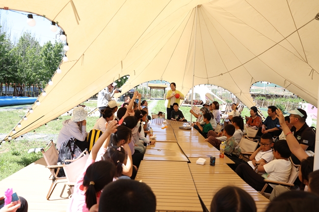 在基地的露營(yíng)野餐環(huán)節(jié),家長(zhǎng)和孩子們圍坐一起分享美食,交流著上午游玩的趣事,氛圍溫馨而融洽。午餐過后的擊鼓傳花互動(dòng)環(huán)節(jié)將活動(dòng)推向了另一個(gè)高潮。隨著鼓聲起落,“花”在孩子們手中歡樂傳遞,“幸運(yùn)”的大小朋友紛紛上臺(tái)表演節(jié)目,唱歌、跳舞、講故事…… 精彩的表演贏得陣陣掌聲,現(xiàn)場(chǎng)氣氛熱烈歡快。