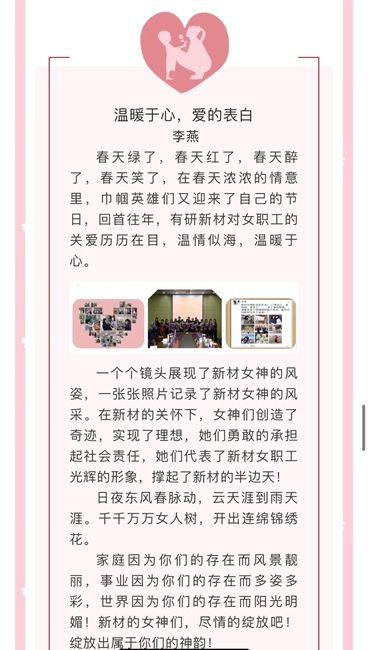 為慶祝“三八”國(guó)際婦女節(jié),進(jìn)一步增強(qiáng)女員工的幸福感、獲得感,體現(xiàn)工會(huì)組織的溫暖,有研新材工會(huì)于近期在公司內(nèi)部組織開(kāi)展了“溫暖于心,愛(ài)的表白”活動(dòng)。