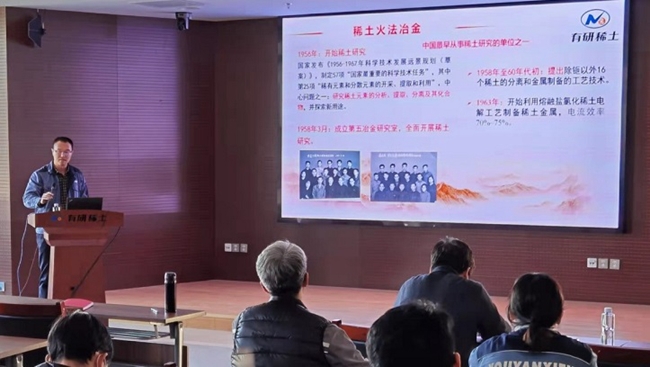 11月24日,有研稀土黨總支舉辦“學黨史·學稀土發(fā)展史”系列講座第三講,公司副總經(jīng)理、中國稀土學會火法冶金委員會主任王志強做了題為“稀土火法冶金”的專題報告。報告以時間為軸,詳細講述了稀土火法冶金的發(fā)展歷史,涵蓋了電解法制備稀土金屬、還原法制備稀土金屬、中重稀土金屬的發(fā)展、輕稀土金屬的發(fā)展和高純稀土及靶材等內(nèi)容,講述了有研稀土火法冶金工藝技術(shù)不斷發(fā)展的歷程。王志強通過回憶有研稀土金屬事業(yè)部、樂山有研公司火法冶金事業(yè)發(fā)展的艱辛歷程,表達對前輩們的敬意,并激勵大家發(fā)揚繼承優(yōu)良傳統(tǒng),努力將火法冶金工作不斷推向前進。