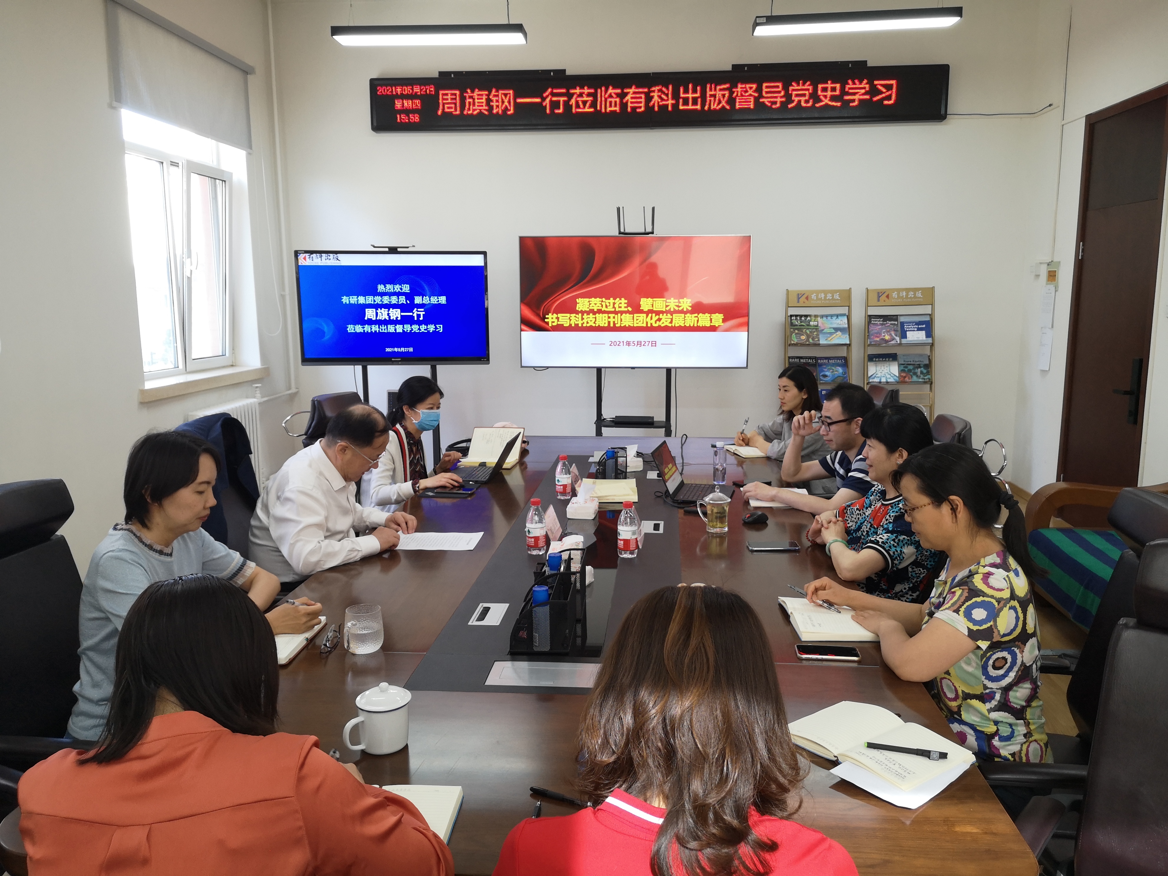 5月27日,有研集團黨委委員、副總經(jīng)理周旗鋼到有科出版督導黨史學習。有科出版黨支部書記、總經(jīng)理錢九紅及全體黨員參加。