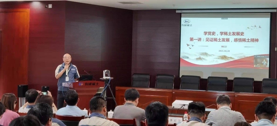 大會第四項,李紅衛(wèi)教授做“學黨史•學稀土發(fā)展史”專題講座第一講——《見證稀土發(fā)展,感悟稀土精神》。報告從1956年有色院研究稀土領域開始,將有研稀土的發(fā)展劃分為奠基創(chuàng)業(yè)、成長發(fā)展、公司化運營和高質(zhì)量發(fā)展階段,對每一階段有研稀土取得的成就,面臨的困難,克服困難的經(jīng)驗,為大家做了深刻的講解,讓大家更清楚地感受到有研稀土的前輩們篳路藍縷,創(chuàng)業(yè)之艱,并從經(jīng)驗中汲取寶貴精神財富,更好地激勵員工在工作中攻堅克難,勇于創(chuàng)新。