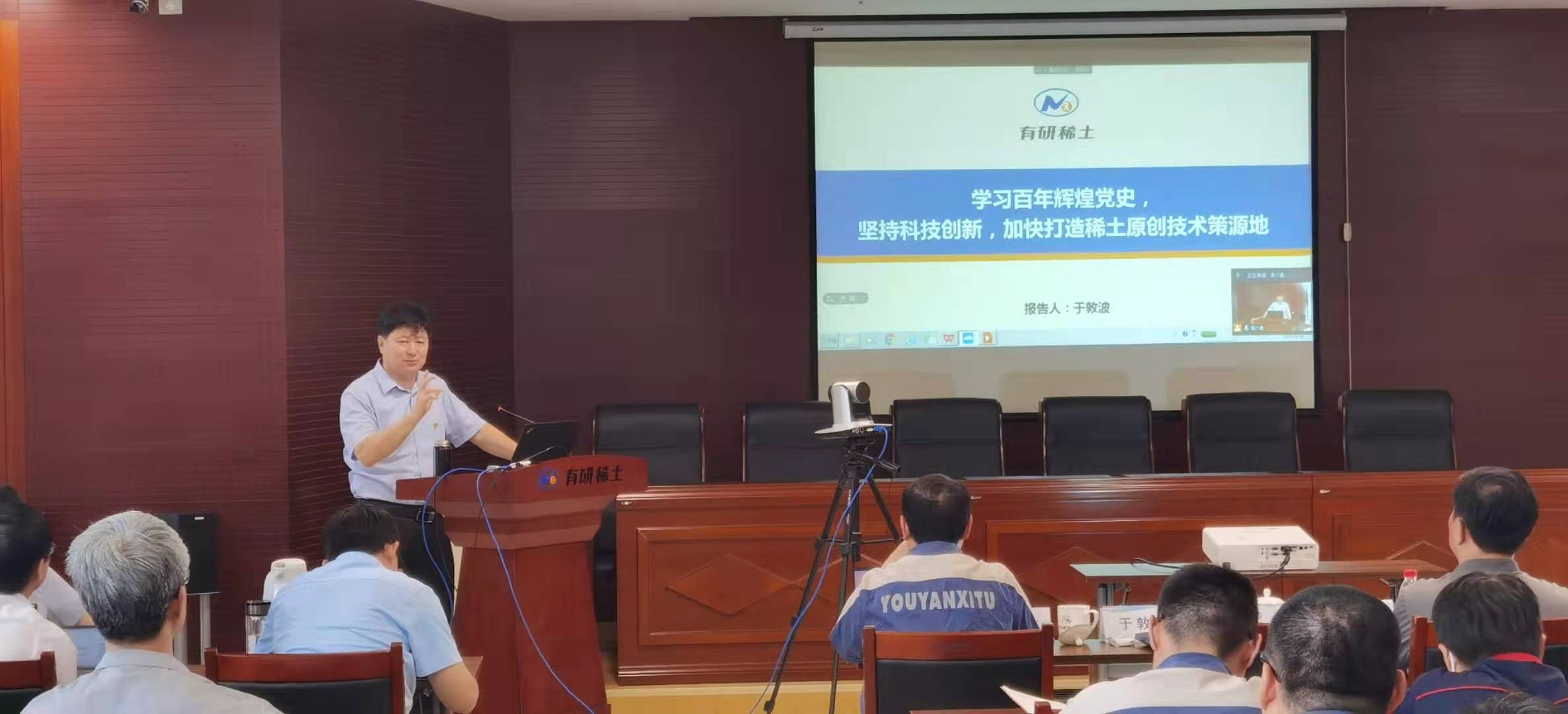 大會第五項,由于敦波書記做《學習百年黨史,堅持科技創(chuàng)新,加快打造稀土原創(chuàng)技術策源地》的專題黨課。他首先將中國共產(chǎn)黨百年歷史進行系統(tǒng)總結和闡述,然后對有研稀土65周年的發(fā)展歷程進行回顧,將中國共產(chǎn)黨的發(fā)展歷程、有研稀土的發(fā)展歷程緊密聯(lián)系起來,最后落腳到奮斗新時代,加快打造稀土原創(chuàng)技術策源地上。從百年黨史和65年有研稀土的發(fā)展史中汲取源源不斷的發(fā)展動力,最終實現(xiàn)有研稀土一體兩翼的飛躍發(fā)展。
