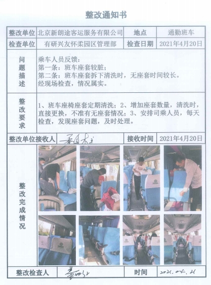 “是換新班車了嗎?怎么這么干凈!”面對煥然一新的班車,乘坐員工發(fā)出了感嘆。4月16日,綜合管理部在收到員工反映問題后第一時間與班車管理單位溝通,經(jīng)過現(xiàn)場檢查后立即聯(lián)絡(luò)協(xié)調(diào),由班車管理單位責(zé)令新朗途客運公司對衛(wèi)生問題進行整改,并由司乘人員進行定期監(jiān)督檢查。為員工營造一個舒適、良好的通勤環(huán)境。