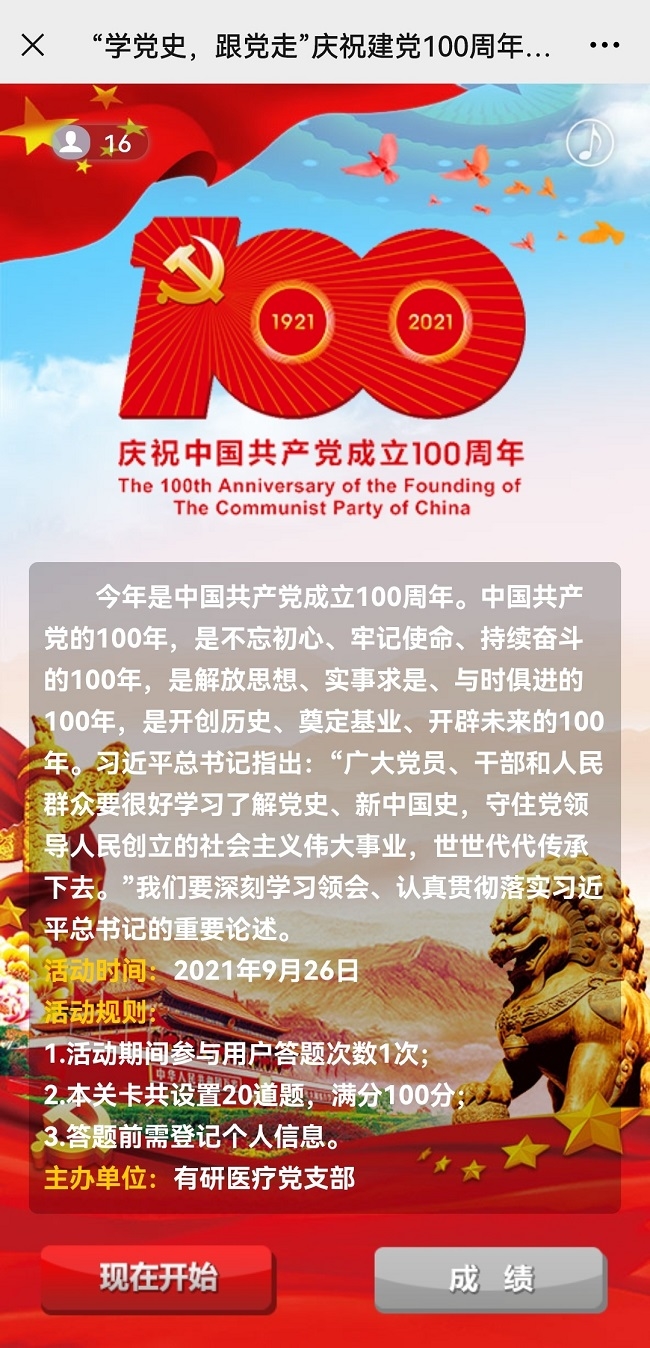 為更好地學(xué)習(xí)黨史、了解黨史,檢驗(yàn)學(xué)習(xí)效果,有研醫(yī)療黨支部于9月26日組織全體黨員、入黨積極分子開展了“學(xué)黨史,跟黨走”慶祝建黨100周年黨史知識(shí)競(jìng)賽。競(jìng)賽包括單選題和多選題,題目隨機(jī)生成,共20道題目,每人1次答題機(jī)會(huì),答題限時(shí)10分鐘。經(jīng)過激烈角逐,最終評(píng)選出一等獎(jiǎng)1名,二等獎(jiǎng)2名,三等獎(jiǎng)3名,優(yōu)秀獎(jiǎng)和參與獎(jiǎng)若干名。
