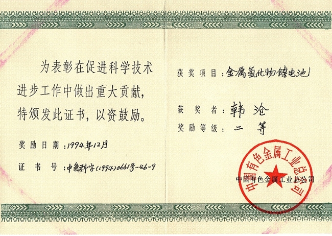 92年剛參加工作的小韓,一身干勁兒,肯下苦工,又愛琢磨,像一朵長在產(chǎn)線上的蘑菇。這樣的狀態(tài)讓他第二個(gè)年頭就與項(xiàng)目組的同事們共同奮戰(zhàn)干成了一件大事兒——搞出了《金屬氫化物鎳電池》項(xiàng)目,受到中國有色金屬工業(yè)總公司頒發(fā)的二等科技進(jìn)步獎(jiǎng)的表彰。