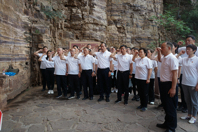 接下來,黨員們沿著紅旗渠建設者的足跡,重走“水長城”,參觀了紅旗渠的分水樞紐——分水閘,徒步登上紅旗渠咽喉工程——青年洞。在青年洞前,大家面向鮮紅的黨旗重溫入黨誓詞,莊嚴宣誓,鏗鏘有力的誓言在青翠的山谷間久久回蕩。