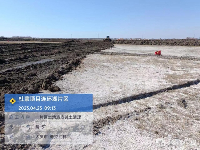 為積極響應(yīng)國(guó)家關(guān)于糧食安全的重大戰(zhàn)略,發(fā)揮生物修復(fù)技術(shù)在第二應(yīng)用場(chǎng)景的優(yōu)勢(shì),土壤修復(fù)團(tuán)隊(duì)審時(shí)度勢(shì)將鹽堿地治理項(xiàng)目作為新的突破口。2022年4月,在新冠疫情極其嚴(yán)重,公共交通不便的情況下,團(tuán)隊(duì)成員連夜自駕16小時(shí)1300余公里抵達(dá)黑龍江杜蒙縣。在鹽堿地現(xiàn)場(chǎng)勘查過(guò)程中,因道路泥濘,車(chē)輛無(wú)法進(jìn)入,團(tuán)隊(duì)成員徒步完成7萬(wàn)畝鹽堿地的現(xiàn)場(chǎng)勘查和初調(diào)樣品采集工作。2023年3月30日,第一期1萬(wàn)畝鹽堿地治理項(xiàng)目完成合同簽署,為國(guó)家鹽堿地治理提供有研方案。