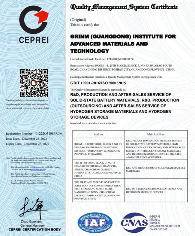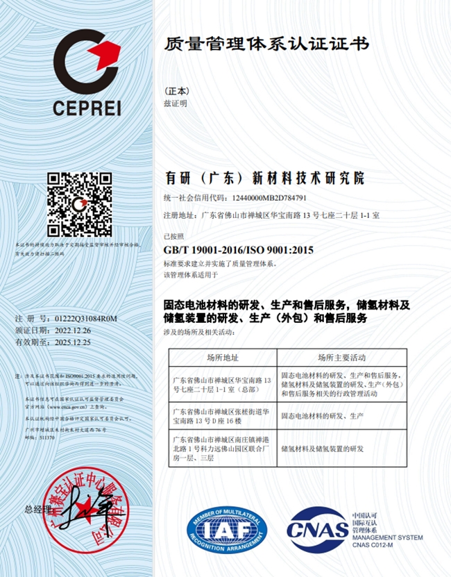有研廣東院自2022年7月建立并實(shí)施ISO9001質(zhì)量管理體系以來,儲(chǔ)氫工程化團(tuán)隊(duì)和固態(tài)電池團(tuán)隊(duì)先后獲得ISO9001:2015質(zhì)量管理體系認(rèn)證證書,為新產(chǎn)品、新技術(shù)轉(zhuǎn)化應(yīng)用提供了重要保障。