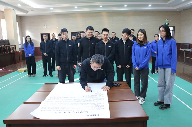 會(huì)上全體員工朗讀奮斗者宣言,并在承諾書上簽字。簽約儀式后,公司組織開展2023年度工作總結(jié)與“師帶徒”特色活動(dòng)考評,全面回顧了公司成立第一年來取得的成績。