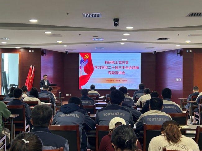 10月31日,有研稀土黨總支召開黨員大會,傳達(dá)學(xué)習(xí)習(xí)近平總書記近期重要講話精神,專題宣講黨的二十屆三中全會精神。有研稀土黨總支全體黨員、技術(shù)生產(chǎn)骨干80余人參加了會議。