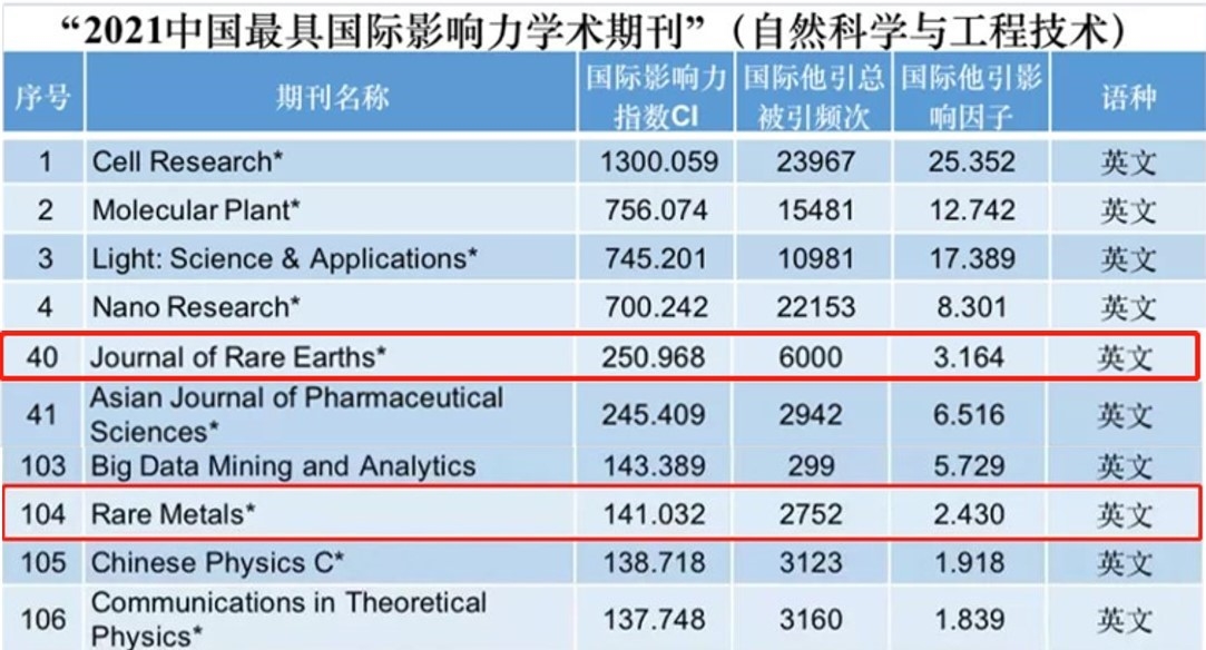 2021年12月6日,有研集團(tuán)主辦的《稀有金屬(英文版)》(Rare Metals)、《稀土學(xué)報(bào)(英文版)》(Journal of Rare Earths)雙雙入選2021年“中國(guó)最具國(guó)際影響力學(xué)術(shù)期刊”榜單,兩刊連續(xù)十年蟬聯(lián)該稱(chēng)號(hào)。