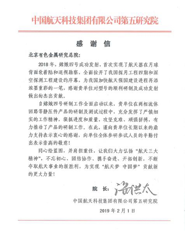 此外,他們還榮獲由人力資源和社會保障部、工信部、國資委等6部委聯(lián)合頒發(fā)的“探月工程嫦娥四號任務(wù)突出貢獻(xiàn)單位”,團(tuán)隊負(fù)責(zé)人也獲得了“探月工程嫦娥四號任務(wù)突出貢獻(xiàn)者”榮譽稱號。中國航天科技集團(tuán)有限公司第五研究院也為北京有色金屬研究總院(現(xiàn)有研科技集團(tuán)有限公司)發(fā)來了感謝信!