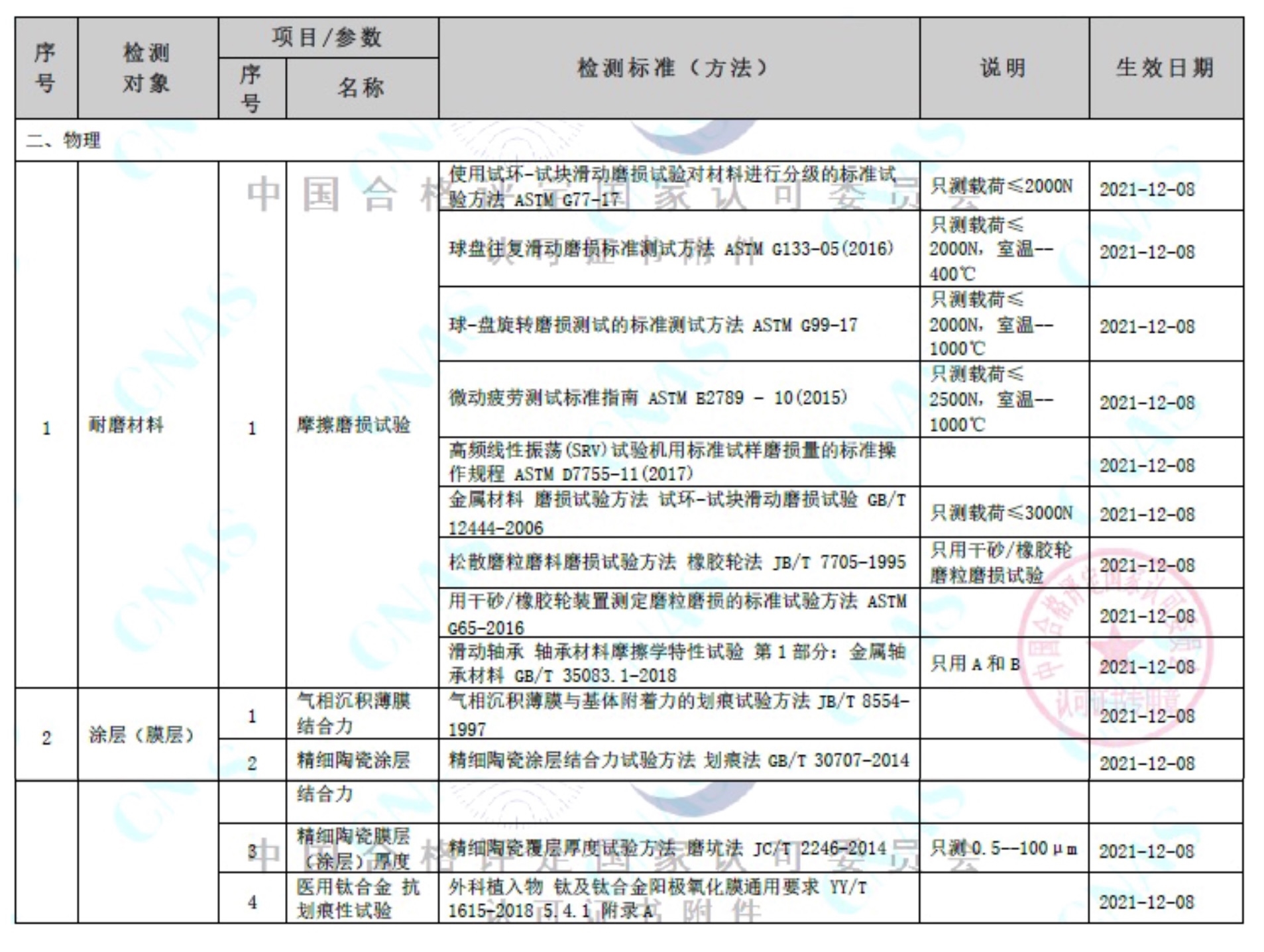 2021年12月,國(guó)合通測(cè)順利通過(guò)摩擦磨損、力學(xué)和環(huán)境可靠性技術(shù)領(lǐng)域的CNAS和CMA擴(kuò)項(xiàng)評(píng)審。摩擦磨損實(shí)驗(yàn)室獲得了摩擦磨損試驗(yàn)、膜層(涂層)結(jié)合力、膜層厚度、抗劃痕性試驗(yàn)等5個(gè)檢測(cè)項(xiàng)目的13項(xiàng)標(biāo)準(zhǔn)方法的CNAS和CMA認(rèn)可,成為國(guó)內(nèi)擁有摩擦磨損檢測(cè)資質(zhì)的權(quán)威第三方機(jī)構(gòu)。