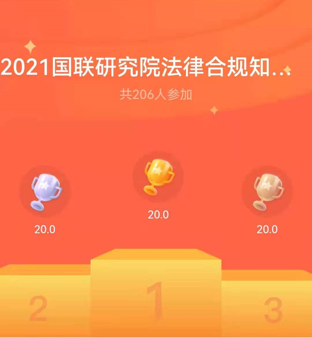組織開展各類知識競賽,全員積極參與。國聯(lián)研究院按照集團統(tǒng)一部署,積極參與集團法律知識競賽并獲組織獎,領導帶頭,全員踴躍參與,通過答題競賽,促進員工學習法律知識,提升學習效果。國聯(lián)研究院自主開展線上答題競賽,圍繞黨群人事、財務管理、安全環(huán)保、科技管理、憲法知識等多領域,強化全員法治意識,普及相關(guān)法律法規(guī)知識。