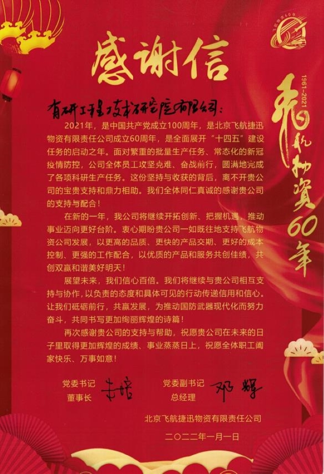 2022年伊始,有研工研院收到北京飛航捷訊物資有限責(zé)任公司發(fā)來的感謝信,感謝有研工研院在2021年給予的寶貴支持和鼎力配合。