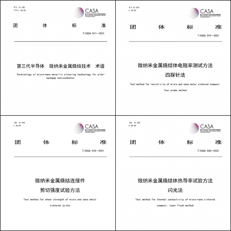 作為主要起草單位之一,有研粉材參與制定了四項(xiàng)微納米金屬燒結(jié)團(tuán)體標(biāo)準(zhǔn),已面向產(chǎn)業(yè)發(fā)布,分別為《第三代半導(dǎo)體微納米金屬燒結(jié)技術(shù) 術(shù)語》(T/CASAS 017—2021)、《微納米金屬燒結(jié)件剪切強(qiáng)度試驗(yàn)方法》(T/CASAS 018—2021)、《微納米金屬燒結(jié)體電阻率試驗(yàn)方法 四探針法》(T/CASAS 019—2021)和《微納米金屬燒結(jié)體熱導(dǎo)率試驗(yàn)方法 閃光法》(T/CASAS 020—2021)。