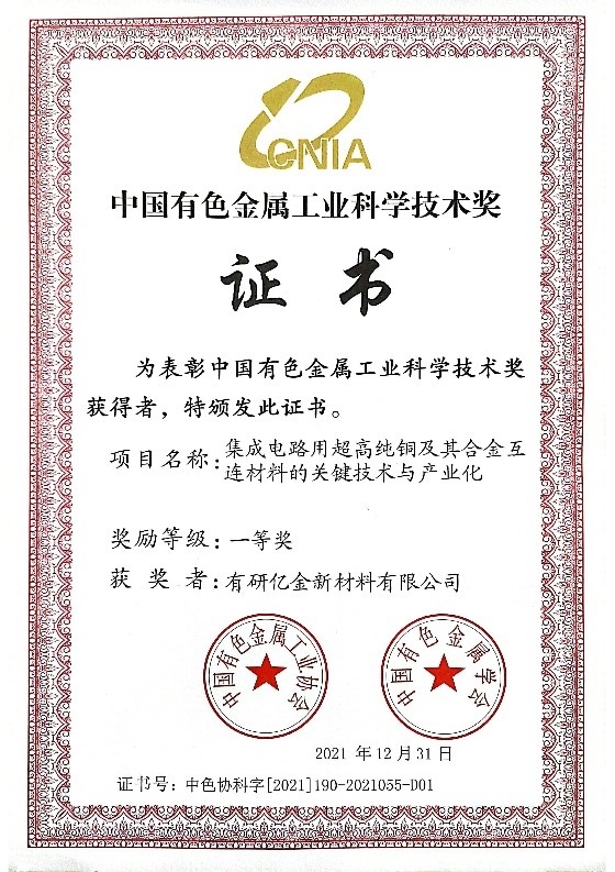近期,中國(guó)有色金屬工業(yè)協(xié)會(huì)、中國(guó)有色金屬學(xué)會(huì)聯(lián)合發(fā)布了《關(guān)于頒發(fā)2021年度中國(guó)有色金屬工業(yè)科學(xué)技術(shù)獎(jiǎng)的通知》,有研億金新材料有限公司(簡(jiǎn)稱有研億金)主持完成的《集成電路用超高純銅及其合金互連材料的關(guān)鍵技術(shù)與產(chǎn)業(yè)化》項(xiàng)目榮獲中國(guó)有色金屬工業(yè)科學(xué)技術(shù)獎(jiǎng)一等獎(jiǎng)。