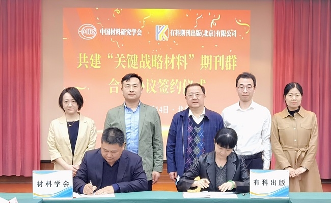 4月14日,有科期刊出版(北京)有限公司與中國(guó)材料研究學(xué)會(huì)共建“關(guān)鍵戰(zhàn)略材料”期刊群合作協(xié)議簽約儀式在北京召開(kāi)。有研集團(tuán)黨委委員、副總經(jīng)理周旗鋼主持簽約儀式。有科出版董事長(zhǎng)、總經(jīng)理錢九紅,中國(guó)材料研究學(xué)會(huì)秘書長(zhǎng)張?jiān)鲋痉謩e代表雙方簽署合作協(xié)議。