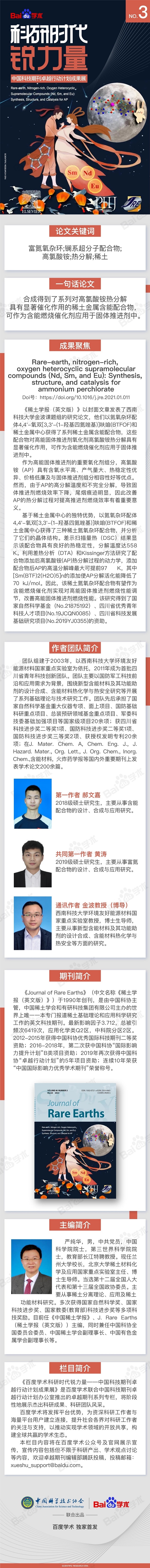 5月12日,由有研集團主辦、有科出版運營的《稀土學報(英文版)》入選“科研時代銳力量—中國科技期刊卓越行動計劃成果展”系列專欄(第3期),該期專題介紹了《稀土學報(英文版)》2022年第3期封面文章《稀土、富氮、氧雜環(huán)超分子化合物(Nd、Sm和Eu)的合成、結(jié)構(gòu)及對高氯酸銨的催化作用》(《Rare-earth, nitrogen-rich, oxygen heterocyclic supramolecular compounds (Nd, Sm, and Eu): Synthesis, structure, and catalysis for ammonium perchlorate》)相關(guān)研究成果及科研團隊。入選成果展將進一步擴大期刊的影響力,展示主編風采。