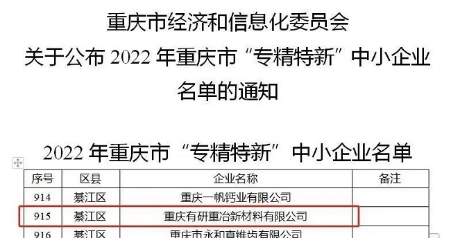 6月1日,重慶市經信委公布2022年重慶市“專精特新”中小企業(yè)名單,有研重冶名列其中。