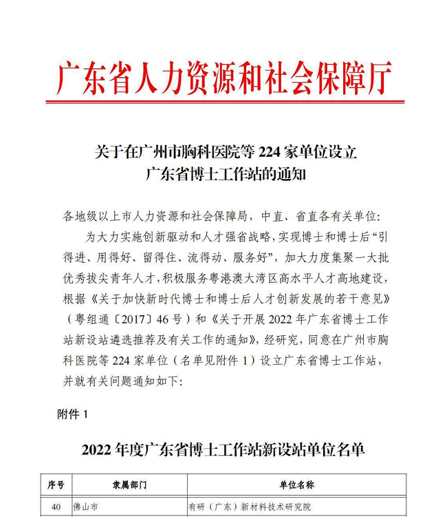 根據(jù)廣東省人力資源和社會(huì)保障廳發(fā)布的《關(guān)于在廣州市胸科醫(yī)院等224家單位設(shè)立廣東省博士工作站的通知》,有研廣東院成功獲批設(shè)立廣東省博士工作站。