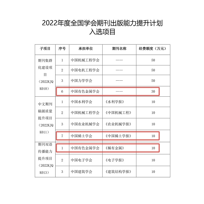 6月14日,中國(guó)科協(xié)發(fā)布了《關(guān)于公布2022年度全國(guó)學(xué)會(huì)期刊出版能力提升計(jì)劃入選項(xiàng)目的通知》,有科出版入選三個(gè)分項(xiàng),總金額50萬元。其中包括期刊集群化建設(shè)項(xiàng)目(項(xiàng)目編號(hào):2022KJQK010,30萬元),期刊雙語(yǔ)傳播能力提升項(xiàng)目(項(xiàng)目編號(hào):2022KJQK013,10萬元),中文期刊稿源質(zhì)量提升項(xiàng)目(項(xiàng)目編號(hào):2022KJQK011,10萬元)。入選項(xiàng)目由中國(guó)有色金屬學(xué)會(huì)、中國(guó)稀土學(xué)會(huì)牽頭申報(bào),有科出版負(fù)責(zé)實(shí)施。