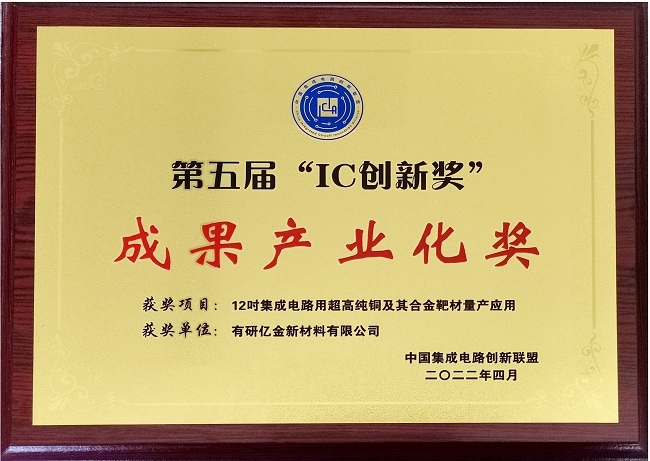 2022年7月9日,中國(guó)集成電路行業(yè)最具影響力的“2022中國(guó)集成電路創(chuàng)新聯(lián)盟大會(huì)”舉行,會(huì)上頒發(fā)了第五屆集成電路產(chǎn)業(yè)技術(shù)創(chuàng)新獎(jiǎng)(簡(jiǎn)稱“IC創(chuàng)新獎(jiǎng)”)。有研億金憑借“12吋集成電路用超高純銅及其合金靶材量產(chǎn)應(yīng)用”項(xiàng)目榮獲第五屆“IC創(chuàng)新獎(jiǎng)-成果產(chǎn)業(yè)化獎(jiǎng)”。
