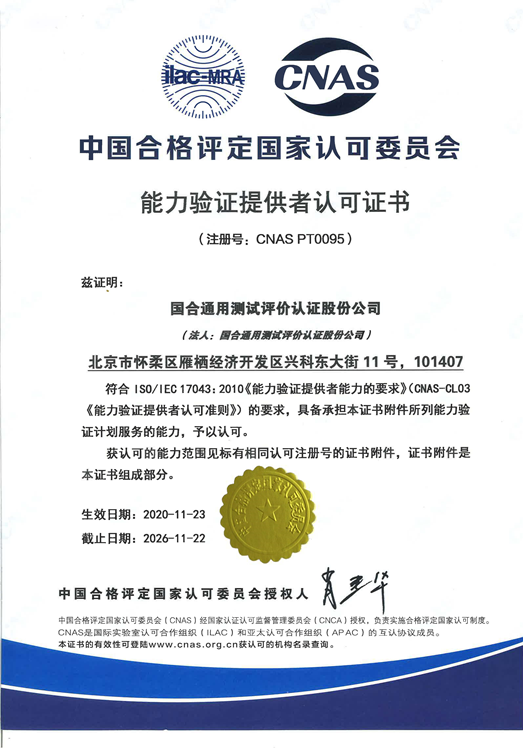 近日,國合通用測試評價認證股份公司能力驗證中心順利通過了中國合格評定國家認可委員會(CNAS)認可,證書編號為CNAS PT0095。這標志著國合通測正式成為“能力驗證提供者”。